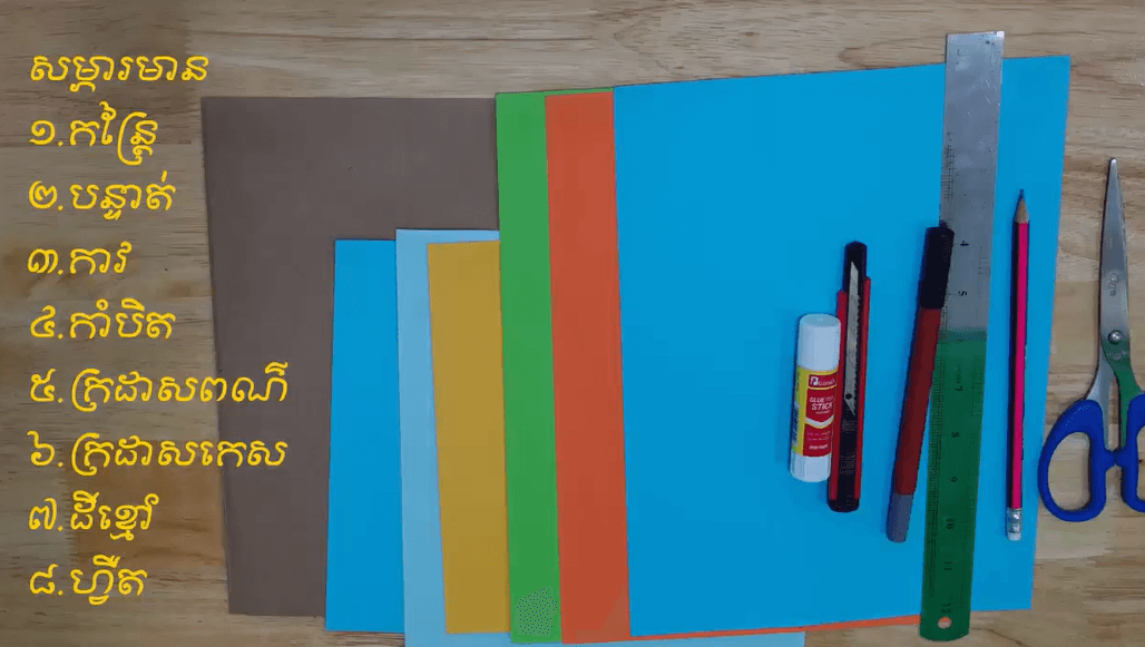ខ្មៅដៃ, កន្ត្រៃ, កាវ, ក្រដាសពណ៌, ប៊ិកហ្វឺត, កាំបិត, បន្ទាត់, ក្រដាសកេស