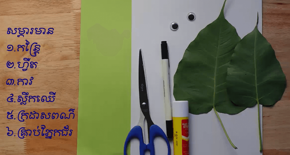 កន្ត្រៃ, កាវ, ក្រដាសពណ៌, ប៊ិកហ្វឺត, ស្លឹកឈើ
