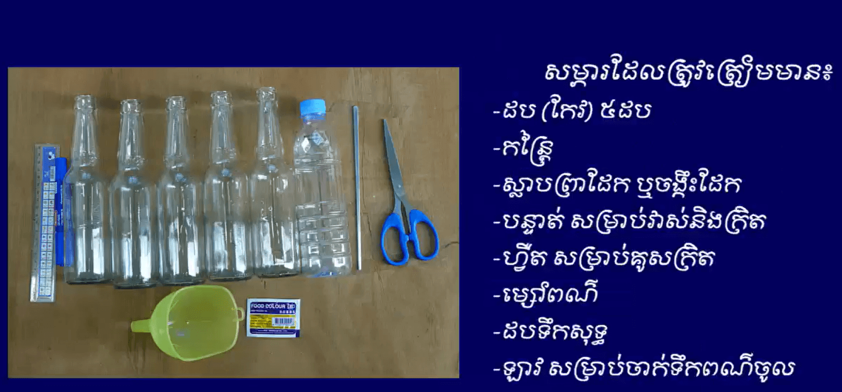 បញ្ជាក់៖ ល្បែងនេះ អ្នកអាចត្រៀមដបច្រើនជាងនេះក៏បានដែរ ទឹកពណ៌ផ្សេងក៏បានដែរ ឬច្រើនពណ៌ក្នុងពេលតែមួយក៏បានដែរ។