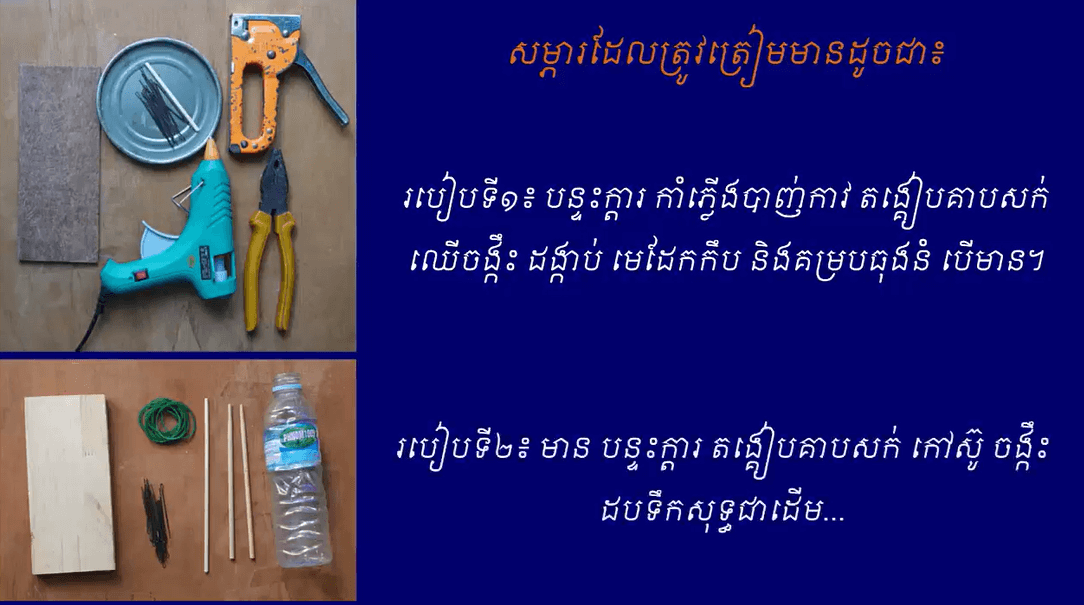 របៀបទី១៖ បន្ទះក្ដារ កាំភ្លើងបាញ់កាវ តង្គៀបគាបសក់ ឈើចង្កឹះ ដង្កាប់ មេដែកកឹបនិងគម្របធុងនំ បើមាន។របៀបទី២៖ មាន បន្ទះក្ដារ តង្គៀបគាបសក់ កៅស៊ូ ចង្កឹះ ដបទឹកសុទ្ធជាដើម…