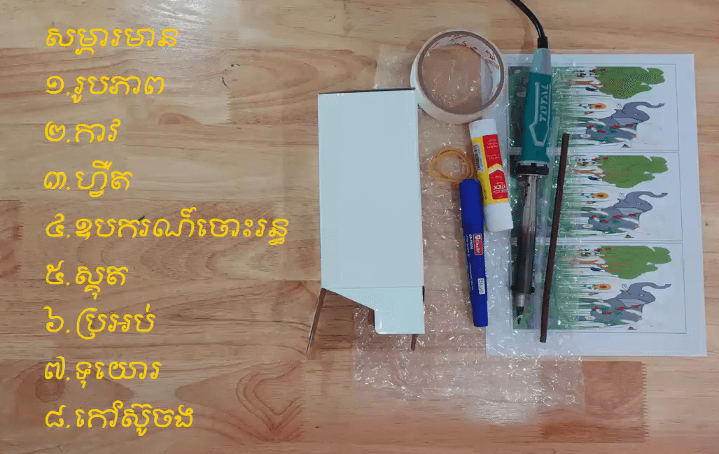 កាវ, ទុយោ, ស្កុត​, ប៊ិកហ្វឺត, កៅស៊ូ, ឧបករណ៍ចោះរន្ធ, ប្រអប់, ថង់