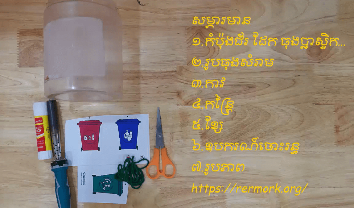 ឧបករណ៍ ៖ កន្រ្តៃ ឧបករណ៍ចោះរុន្ធ ខ្សែ ក្រដាសរូបធុងសំរាម កាវស្អិត និងធុងឬក្រឡជ័រធំល្មមមួយ