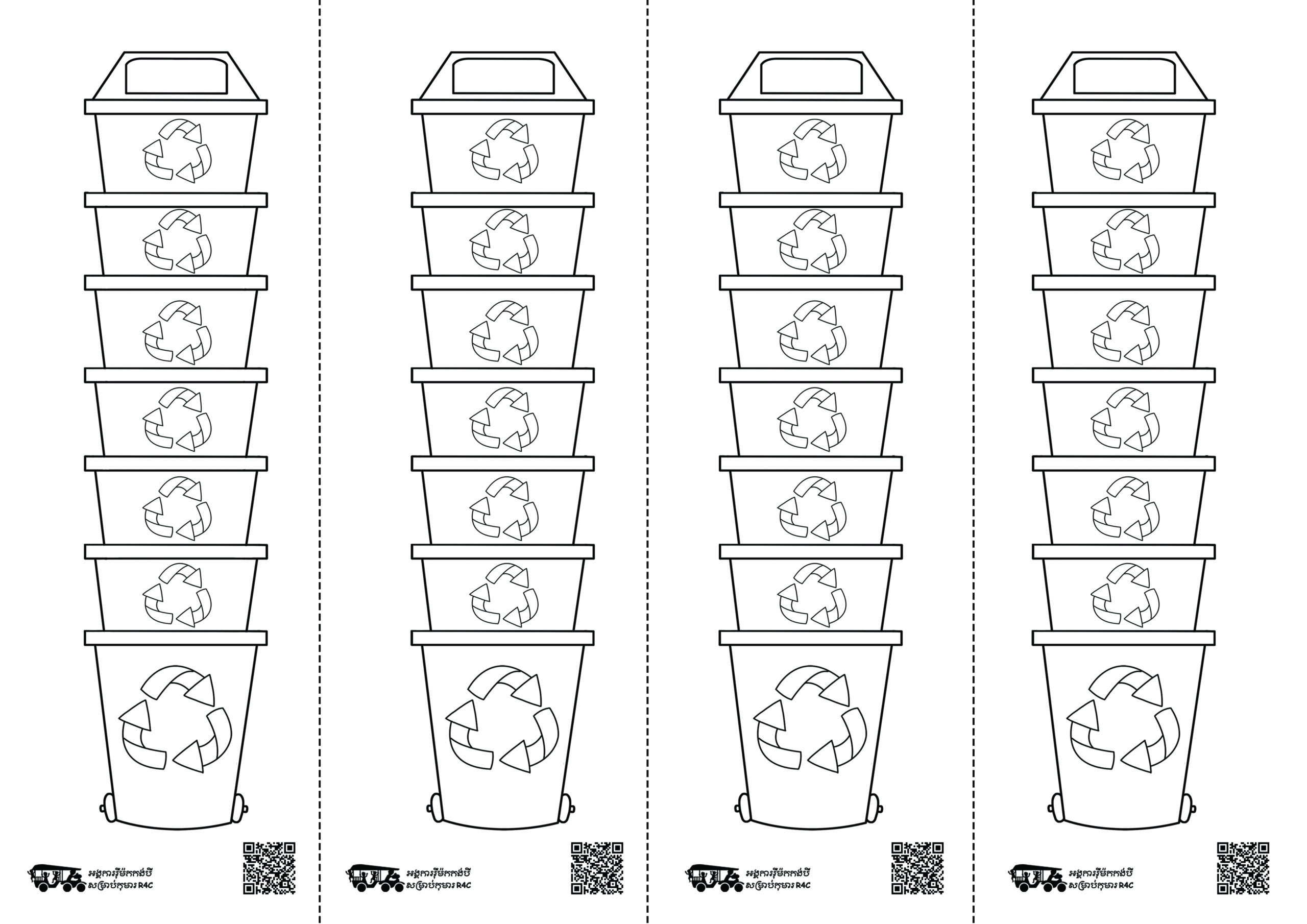 ឧបករណ៍ ៖ ក្រដាសកាតធុងសំរាមដែលមានពីរប្រភេទ សខ្មៅ និងពណ៌។ កាតទាំងអស់ត្រូវកាត់ជាជួរតាមបន្ទាត់ឈរជាជួរ និងអ៊ុតវាឱ្យបានស្អាត សម្រាប់តែកាតពណ៌ទេ។ កាតសខ្មៅ ទុកសម្រាប់ផាត់ពណ៌ ដូច្នេះមិនចាំបាច់អ៊ុតទេ។ គម្របដបមួយចំនួនដែលមានមានគ្រប់ពណ៌ដូចនឹងកាត់ធុងសំរាម (សម្រាប់ចែកទៅតាមក្រុមនីមួយៗ) ឬក្រដាសពណ៌ ឬជាអ្វីក៏បាន ឱ្យតែមានពណ៌ដូចទៅនឹងធុងសំរាមនីមួយៗជាការស្រេច។